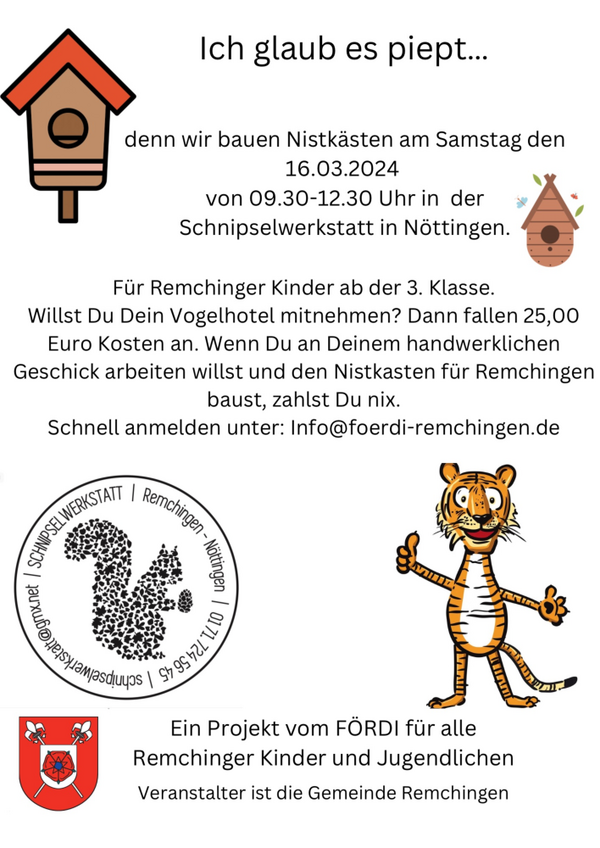 Willst Du Dein Vogelhotel mitnehmen? Dann fallen 25,00 Euro Kosten an. Wenn Du an Deinem handwerklichen Geschick arbeiten willst und den Nistkasten für Remchingen baust, zahlst Du nix.